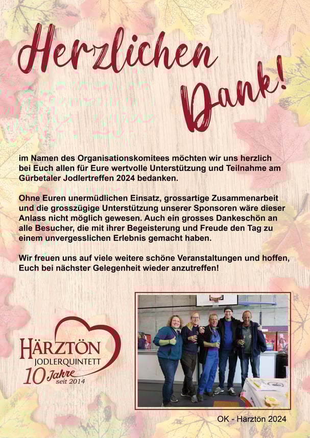 Anlässlich unseres diesjährigen 10-jährigen Jubiläums führen wir vom Jodlerquintett Härztön das Gürbetaler Jodlertreffen 2024 durch.
